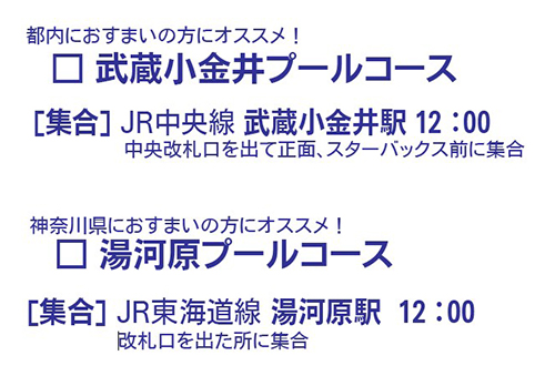 ご参加のプールによって湯河原駅、または武蔵小金井駅に集合。