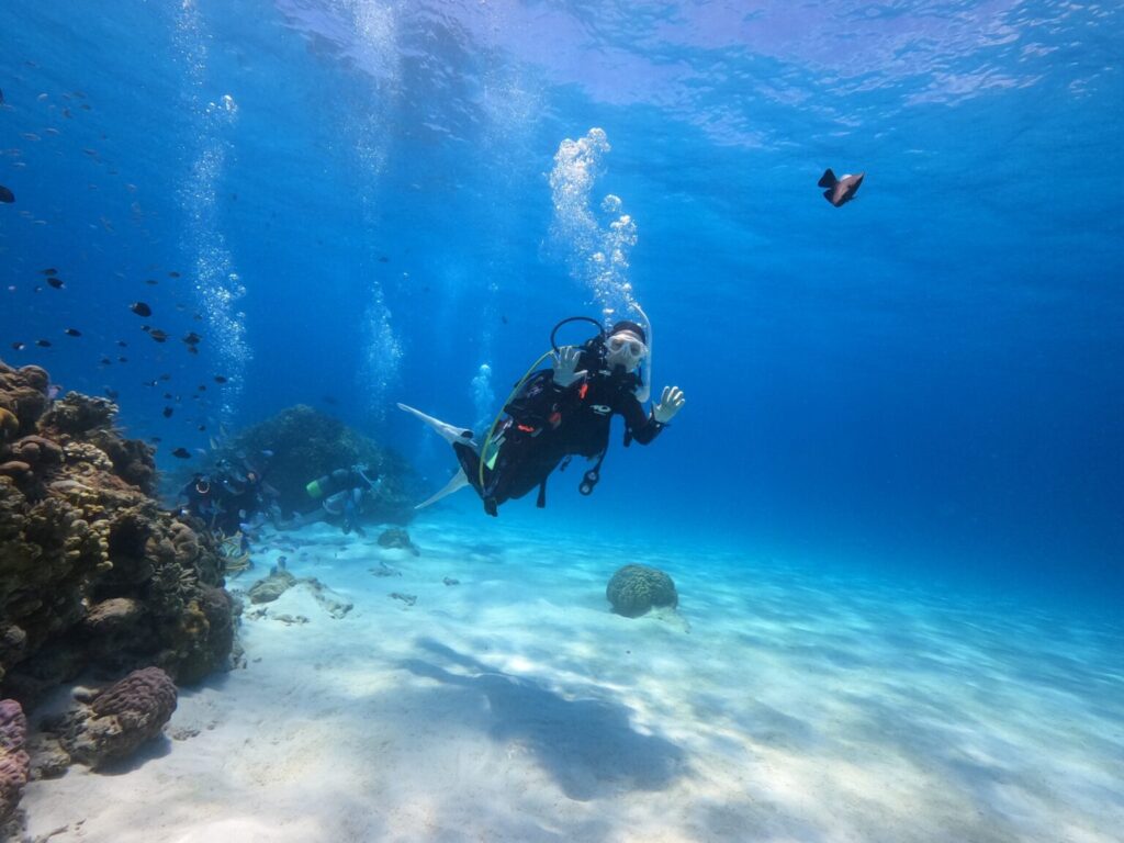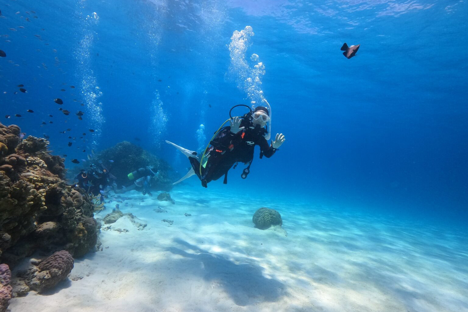 ダイバーの影が砂地にくっきり見えるほどの日差しと透明度!
