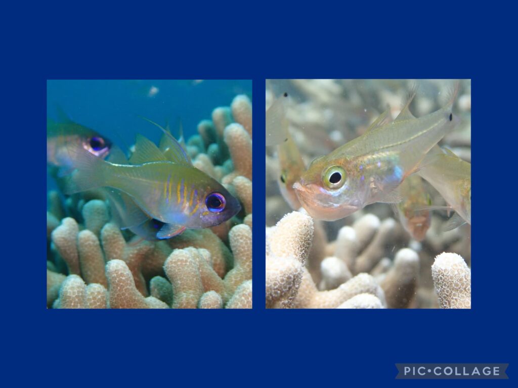 青目が美しい、通称 “ブルーアイ” (左、イトヒキテンジクダイ)や、