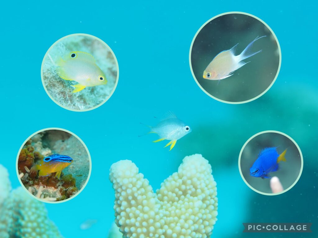 んーっ、マルスズメダイ幼魚の尾ビレの分岐がたまらんっ!(右上)