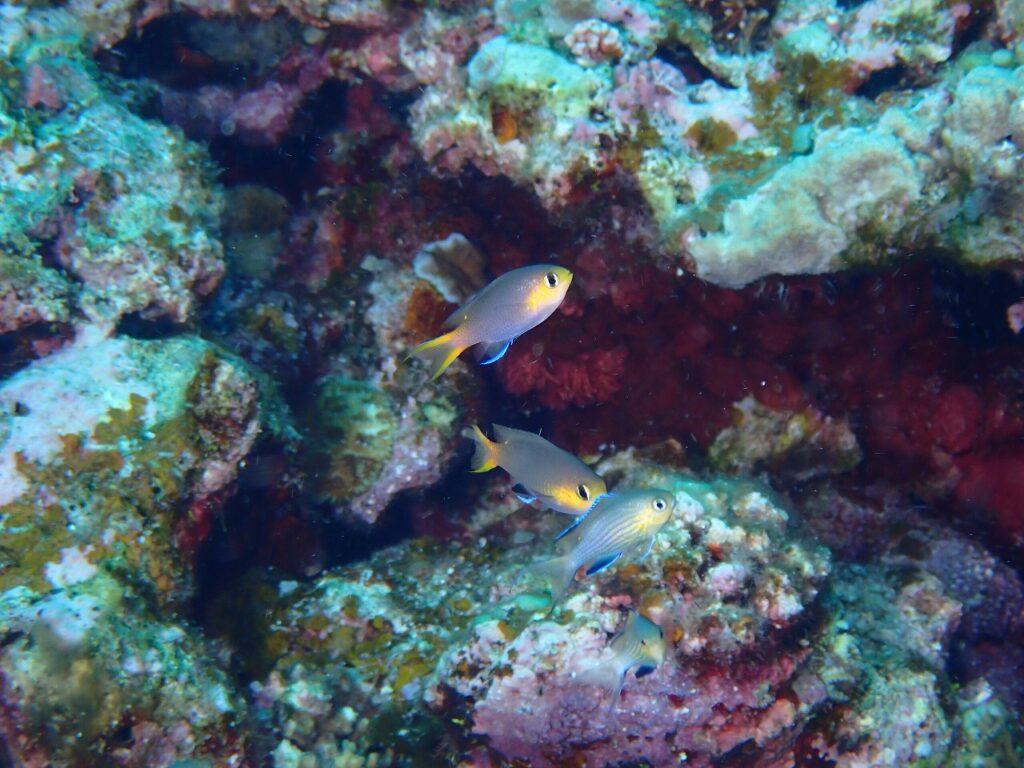 中層には、オキナワスズメダイとキホシスズメダイが気持ちよさそうに泳いでいて