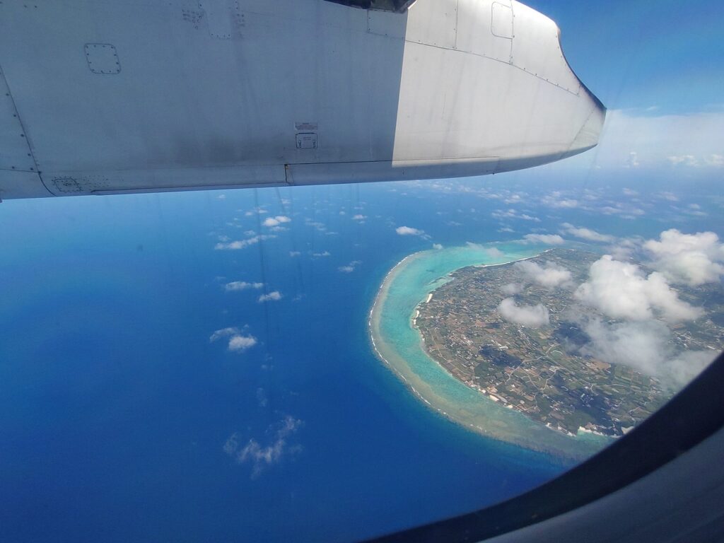 飛行機から見ても、外洋とリーフの海の色の違いもわかりやすいくらい。