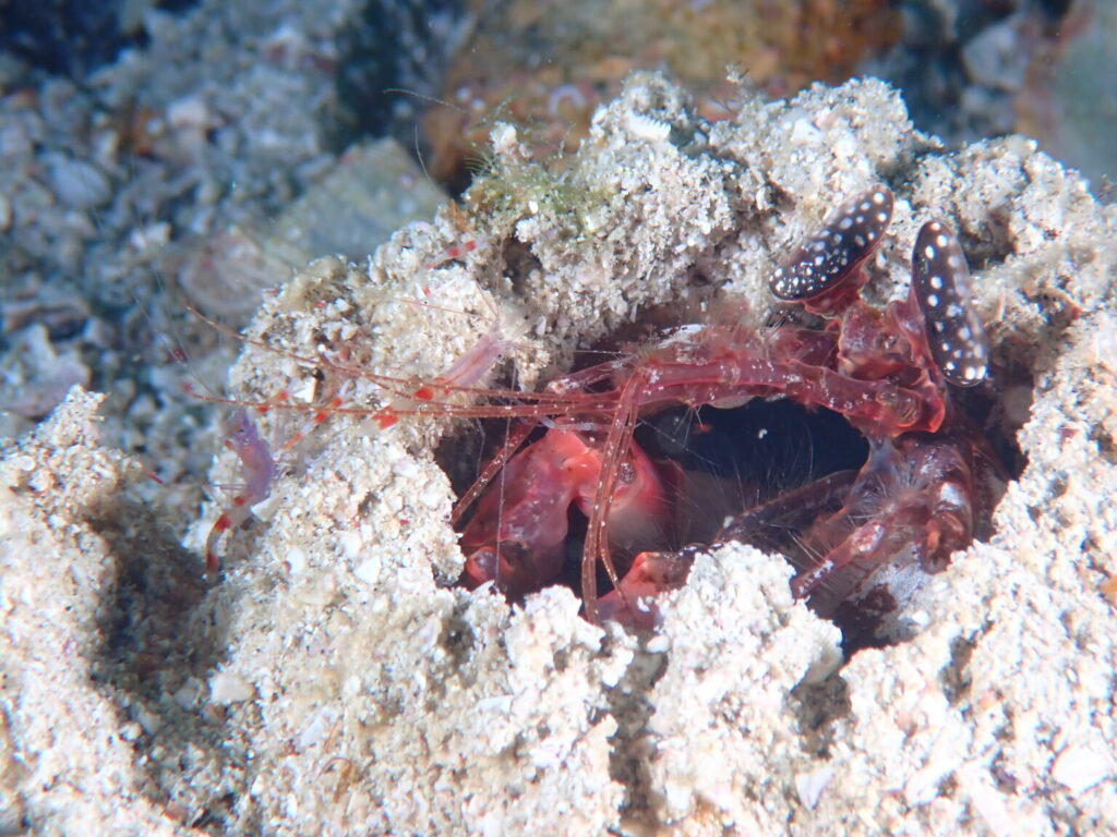 トラフシャコの巣穴のヨコで二匹でわいわいしてました!色が紫でかわいいです。