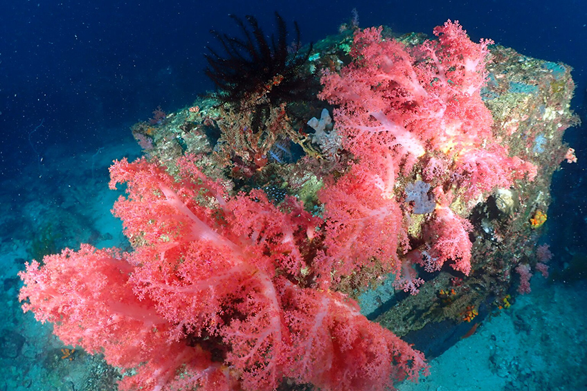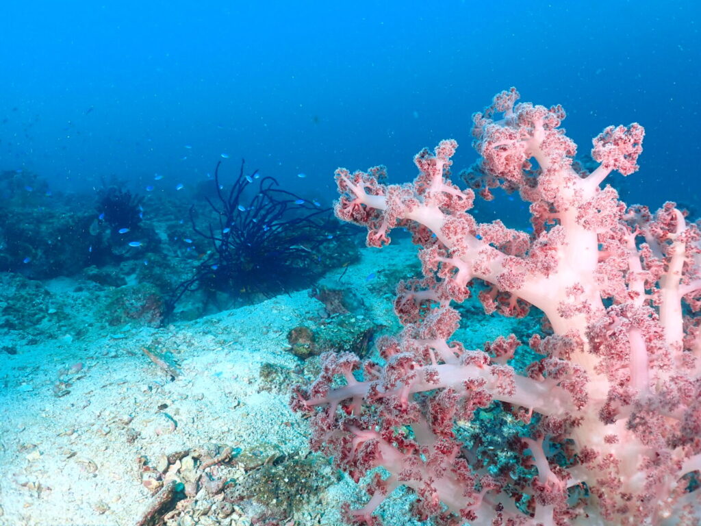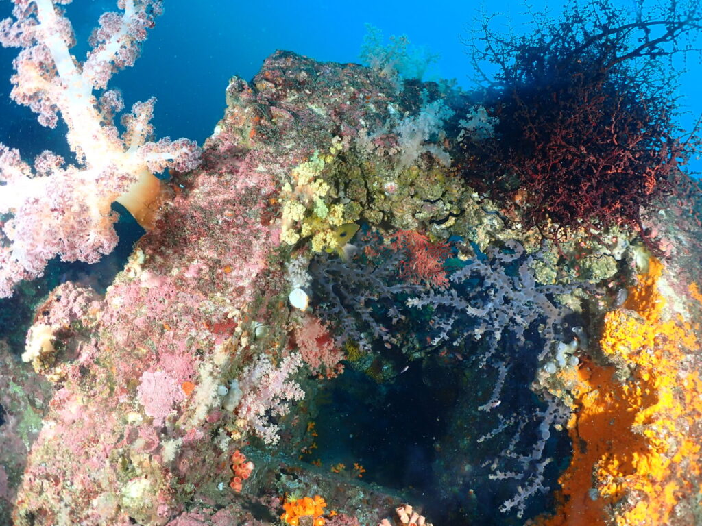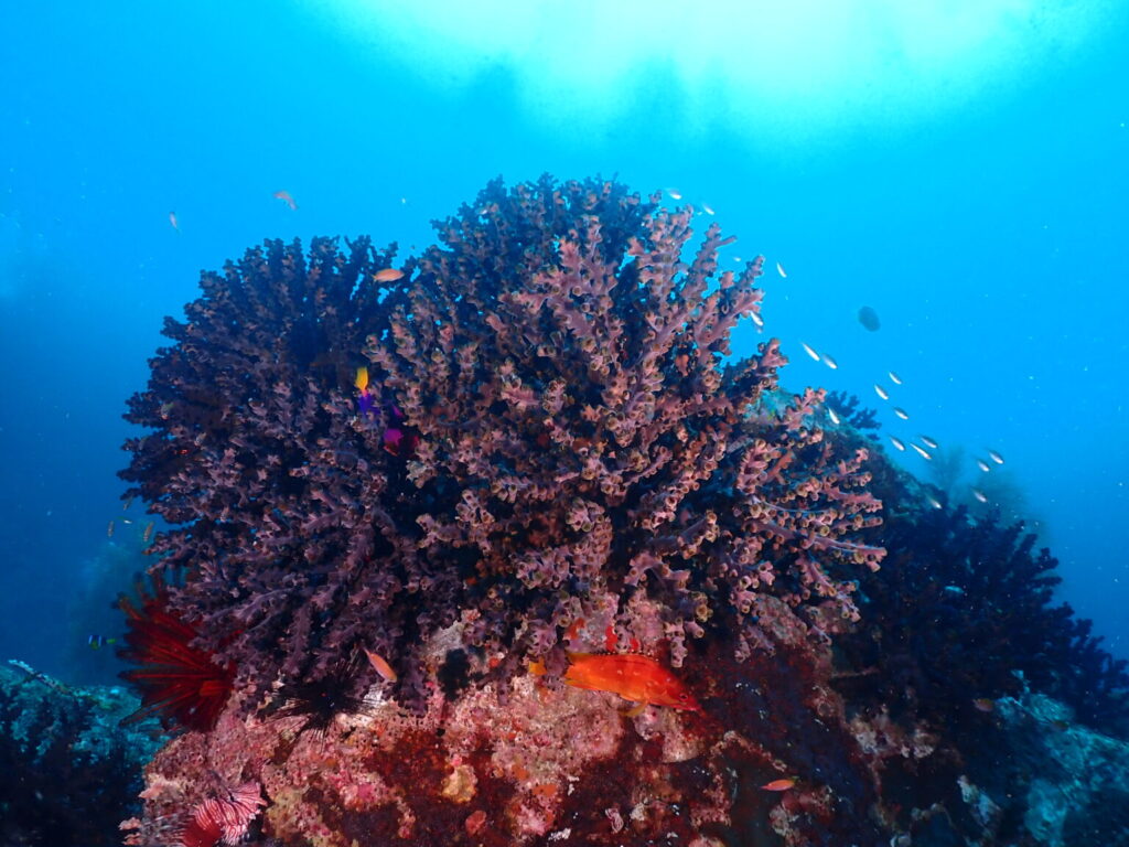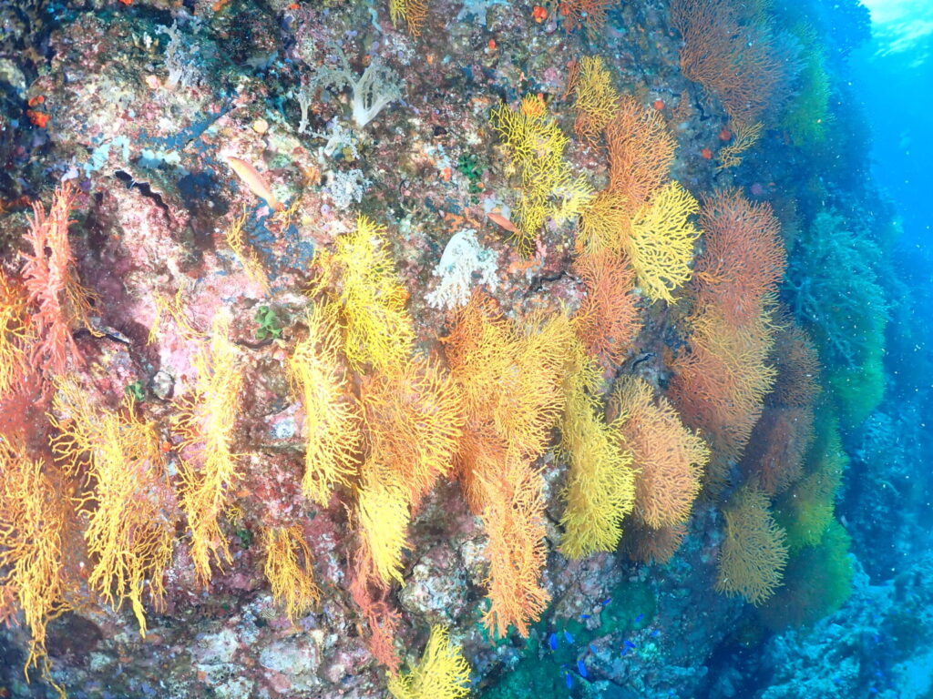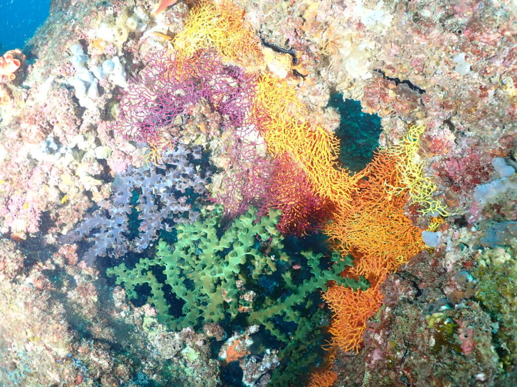 【ミツハエ】では、漁礁にまたまたカラフルなイソバナやソフトコーラル!