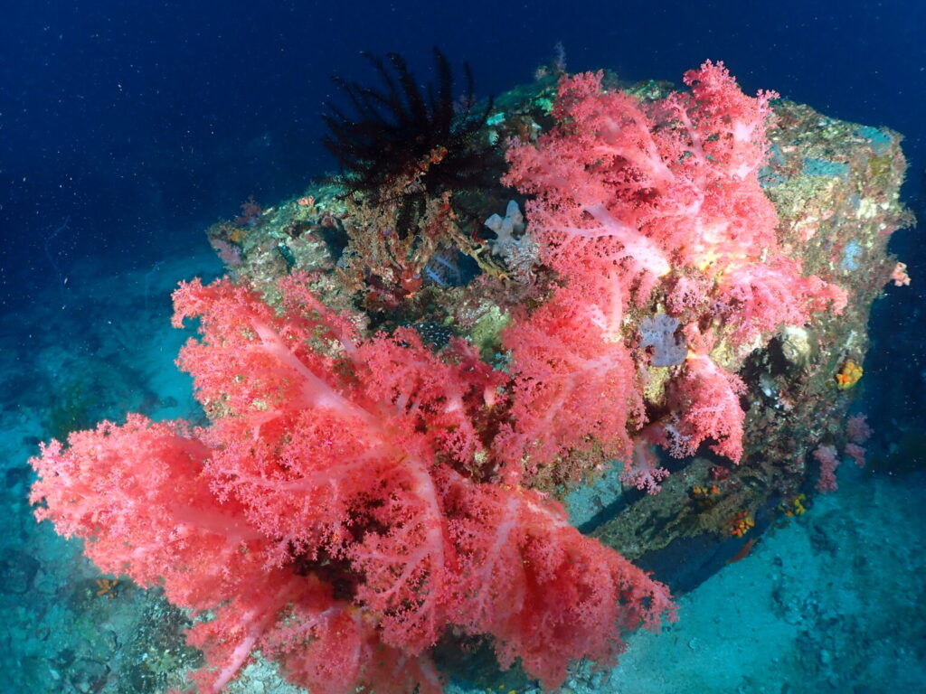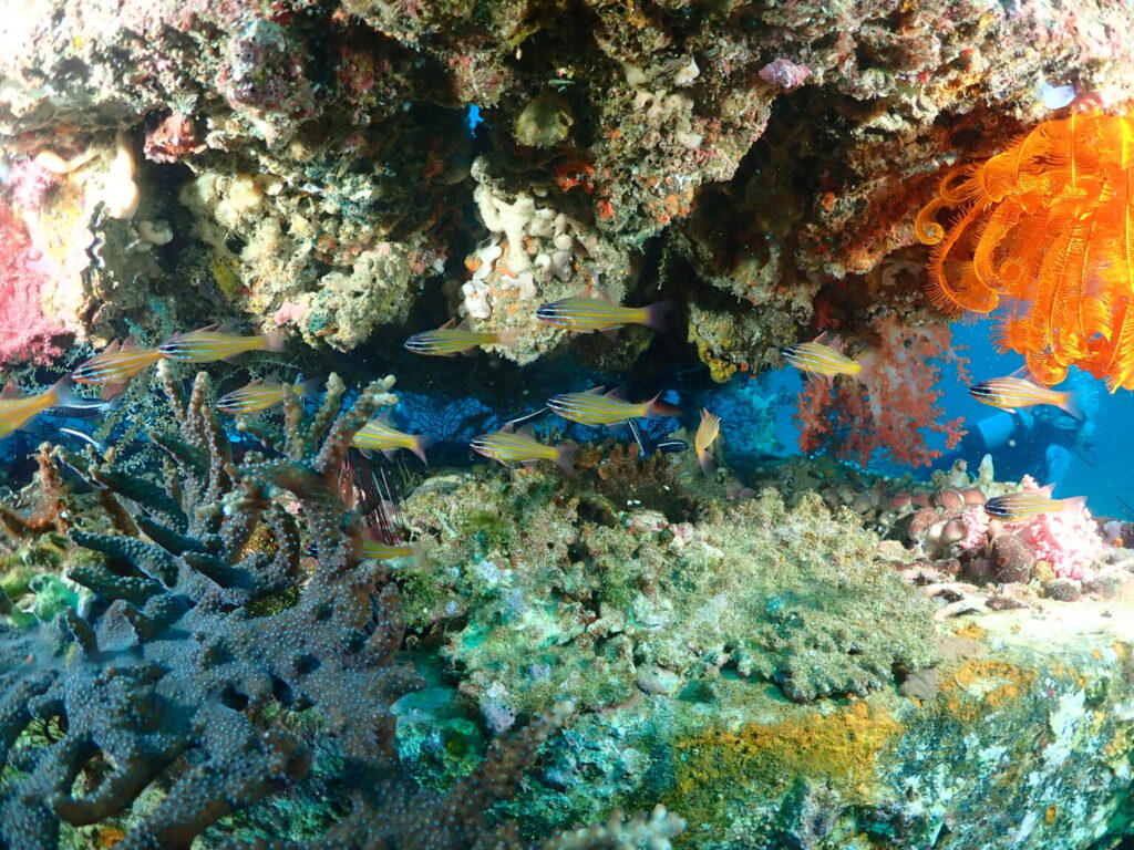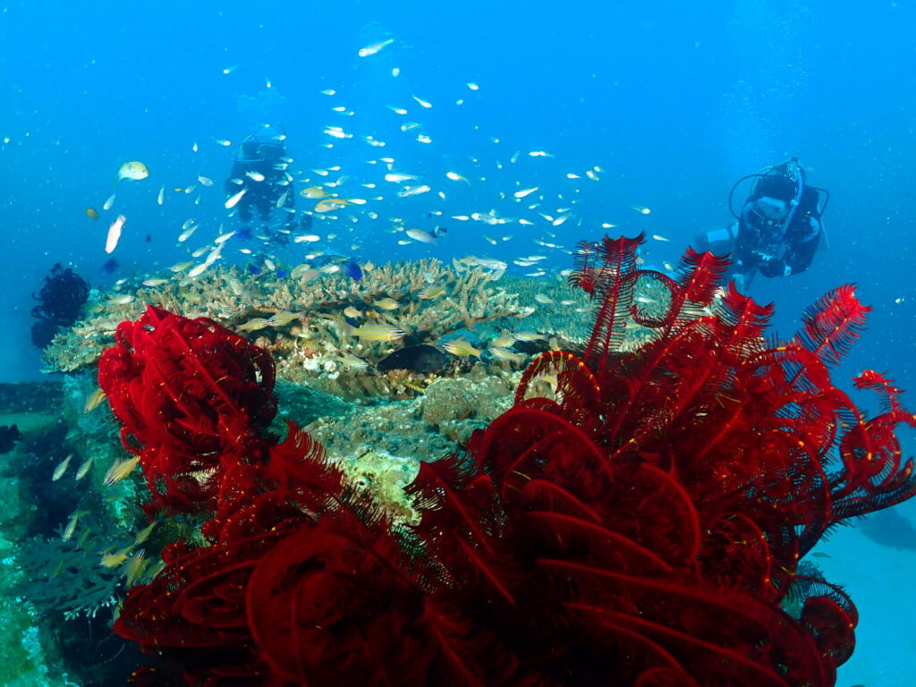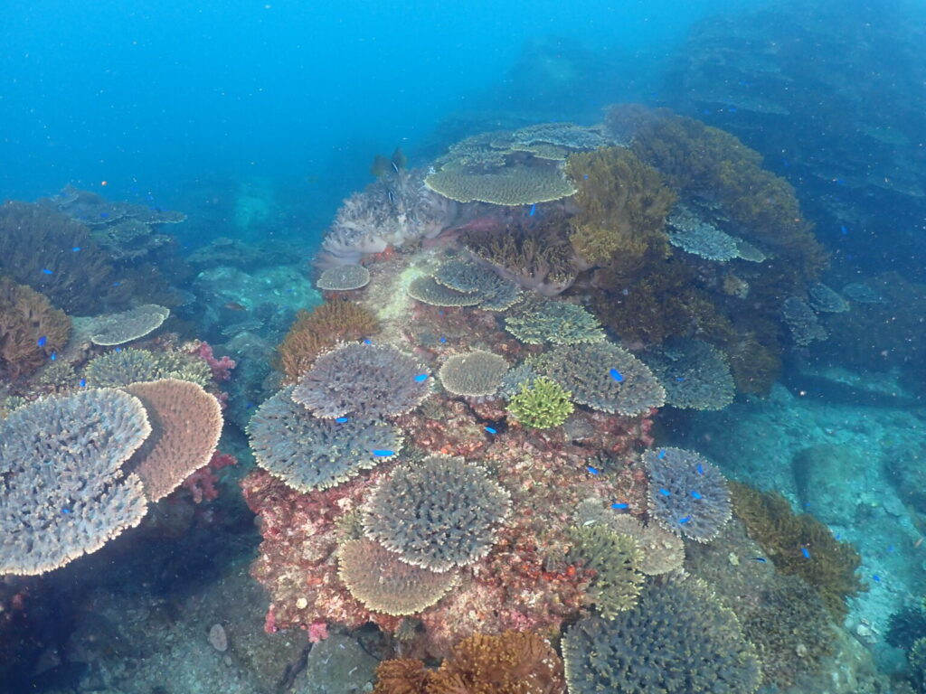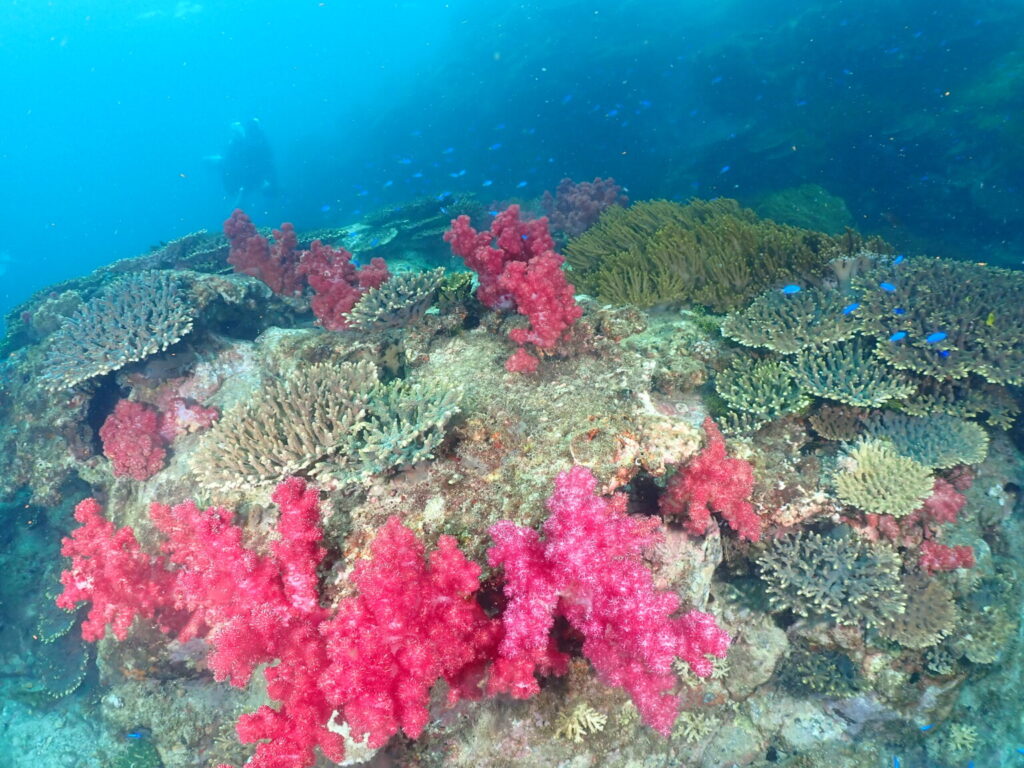 ダイビングサービスからその名の通り近いポイントで漁礁が沈んでいますが、漁礁の上もすごくカラフルで生き物であふれています。