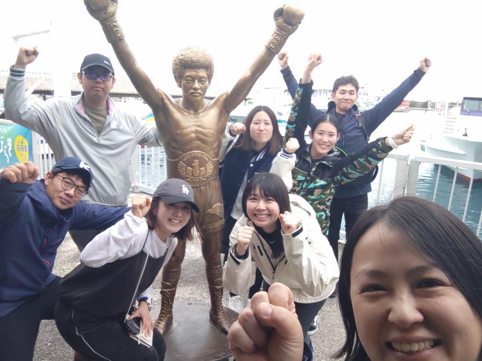 石垣島出身の具志堅さんのモニュメントを囲んでいつもの記念撮影です