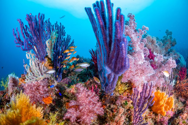 色とりどりの美しいソフトコーラルの群生が圧巻です。